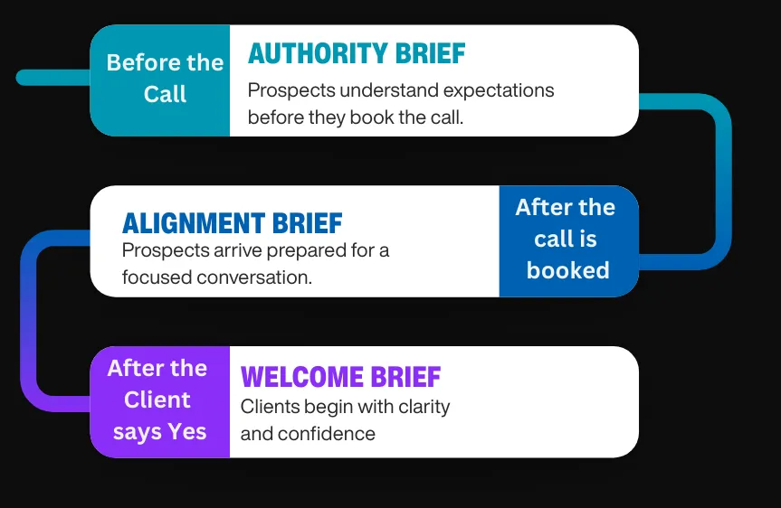 Instead of repeating the same explanations on every call, your prospects hear short, strategic briefings that clarify your process, expectations, and standards at the right moments in the client journey.